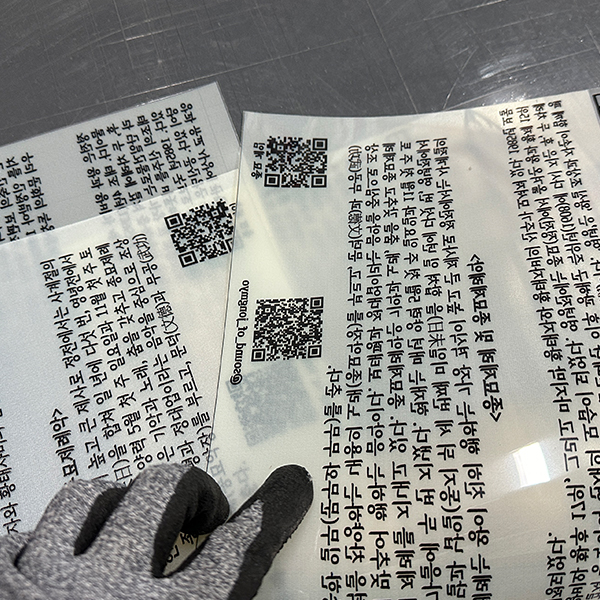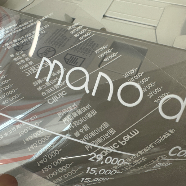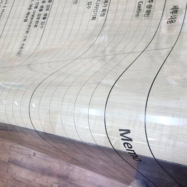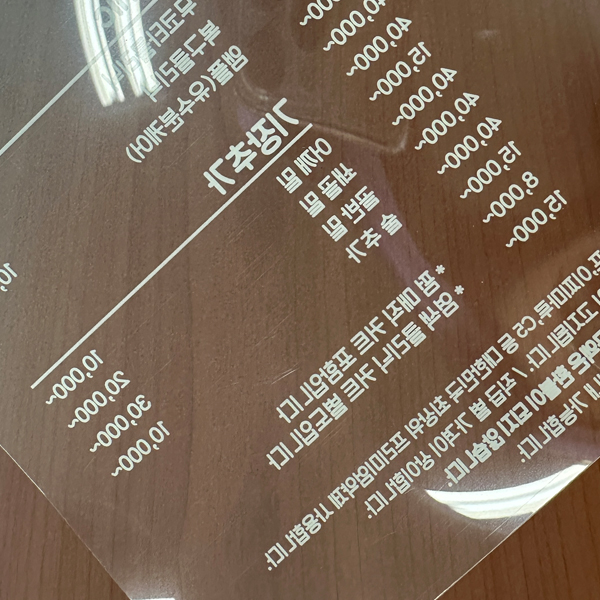 투명하지만 두께감이 있어 쉽게 구겨지지 않는 재질입니다.형태 유지력이 좋아 별도 코팅 없이도 안정감이 있습니다.빛을 받으면 인쇄물이 더욱 또렷하게 보입니다.테이블 스탠드, 거치형 안내판, POP 제작에 적합합니다.