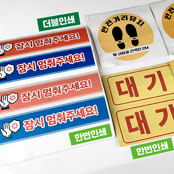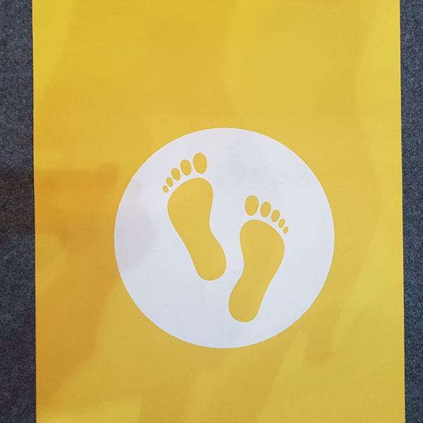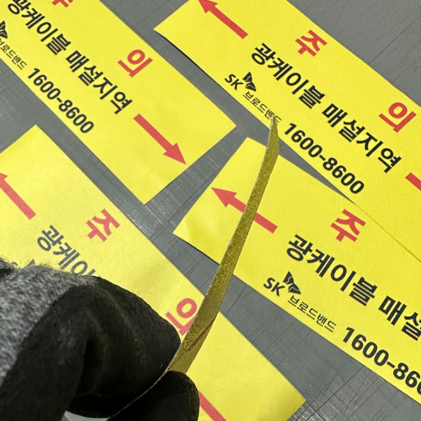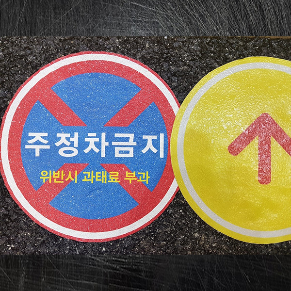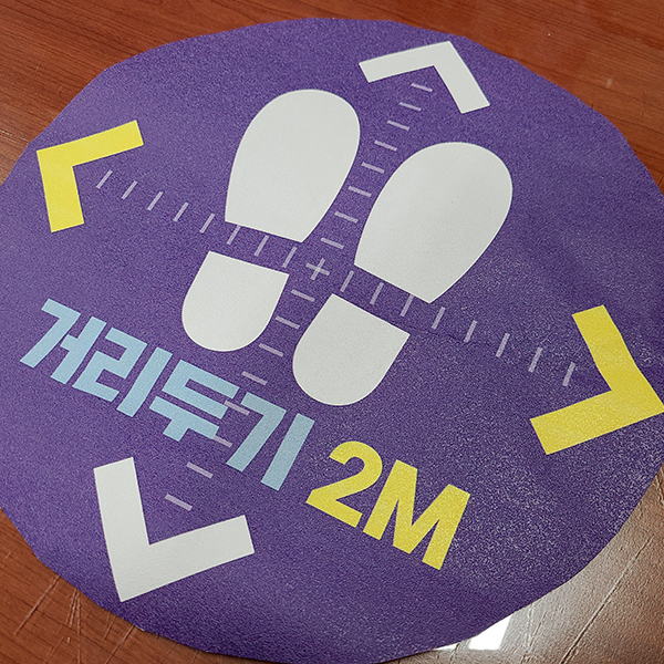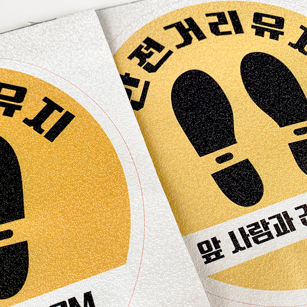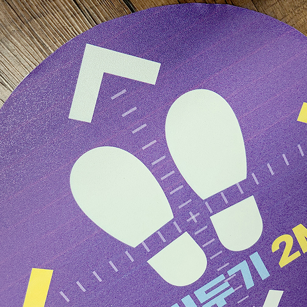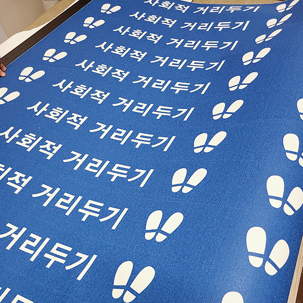 바닥 전용 시트지로 거친 표면에도 잘 부착됩니다.접착력이 강해 외부 환경에서도 쉽게 떨어지지 않습니다.보행 중에도 잘 보이도록 인쇄 표현력이 우수합니다.행사장, 바닥 안내 사인에 적합합니다.